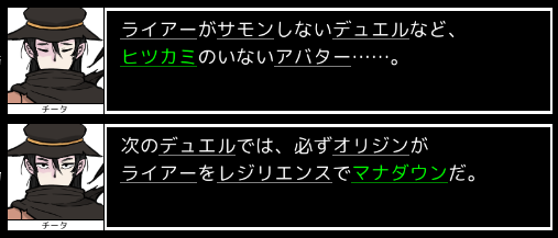 「ライアーをレジリエンスでマナダウンしたいけど、相手のアバターのビッグバンは『オリジンが最初にサモンしたソウルがオブリビされずに4回のエンドフェイズを迎えること』とあるので、ジェムのためにコニコをサモンしてコレクトしたり、ホールドしたりしたいよね。」