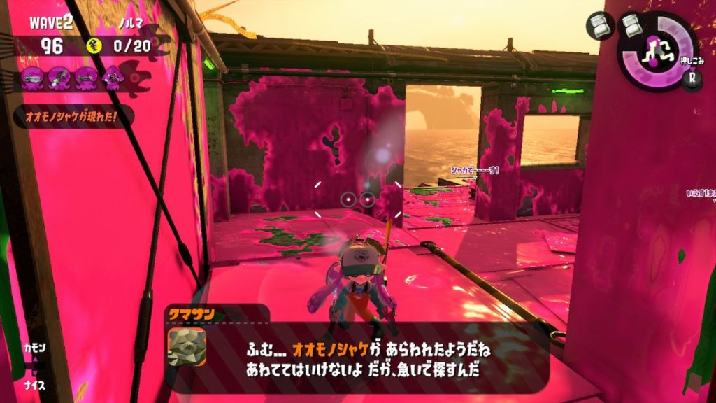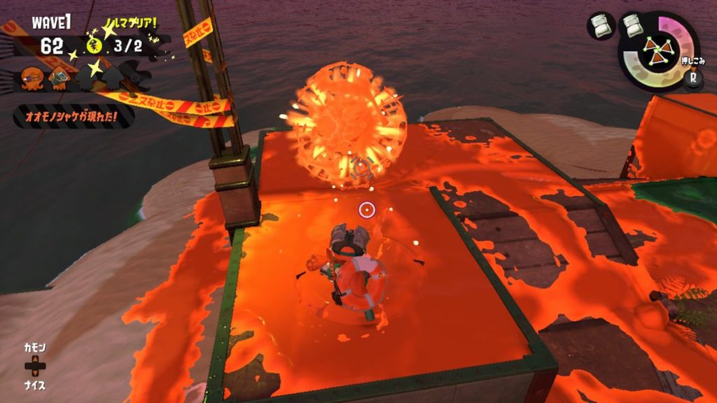 出てきた金シャケに対しては、フルチャージ攻撃ではなく、ZR連打のパスパスショットのほうがイクラをよく落とします。(☆3)。